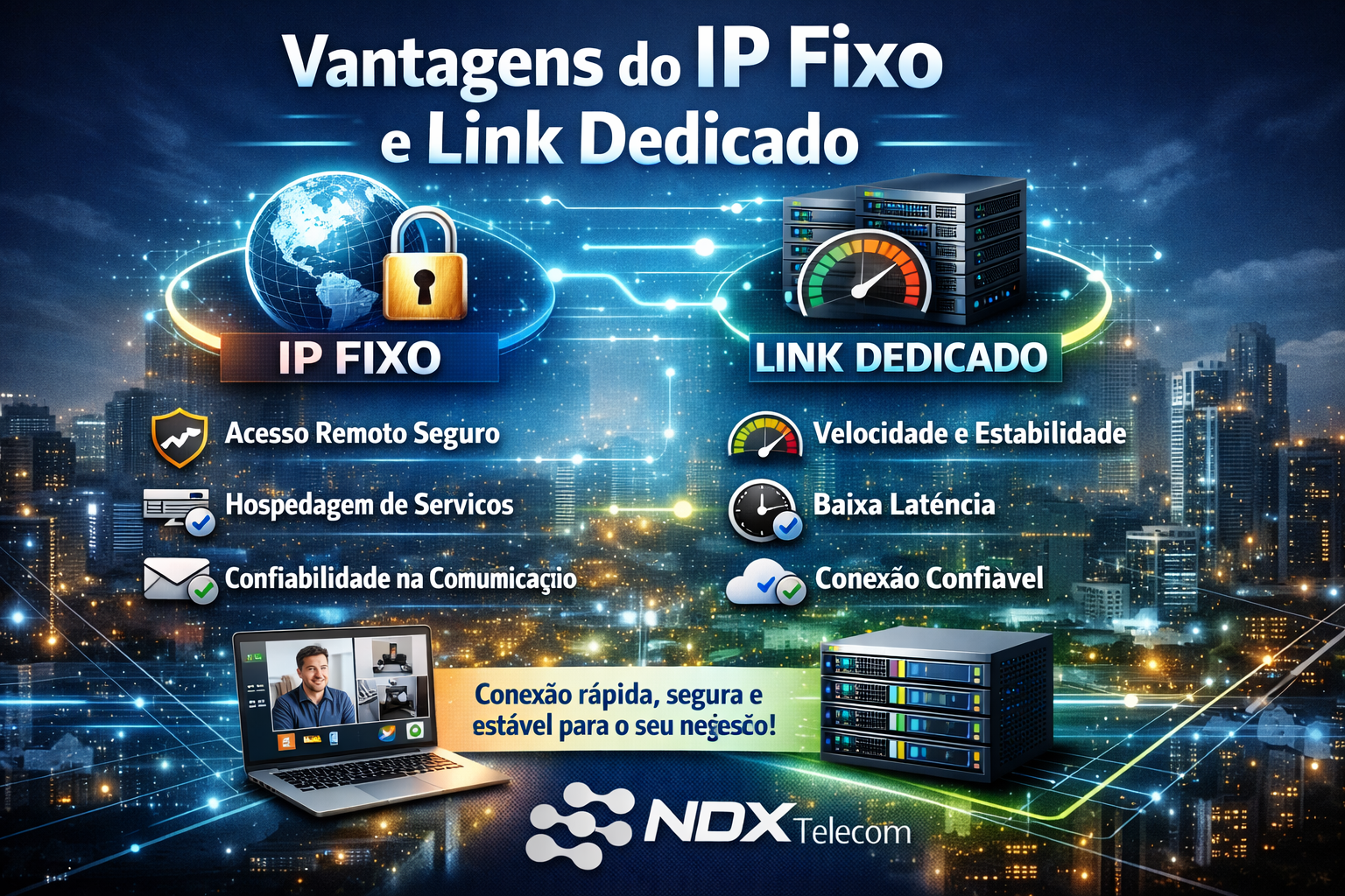 Um IP fixo válido facilita acesso, segurança e confiabilidade para serviços online, enquanto um link dedicado garante velocidade, estabilidade e desempenho consistentes. Juntos, proporcionam uma infraestrutura de internet profissional, ideal para empresas ou usuários que não podem depender de interrupções ou instabilidade de rede.
